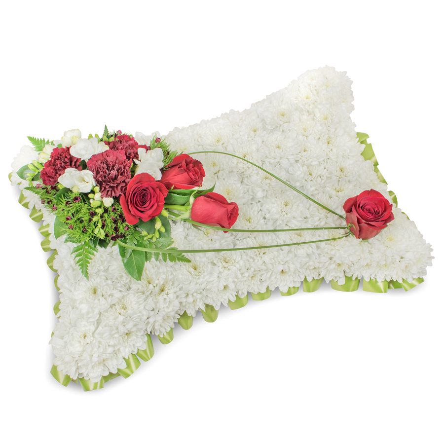 Express your heartfelt condolences with our beautifully crafted sympathy bouquet. This elegant arrangement features a delicate mix of white chrysanthemums, red roses, white freesias, dark red carnations, dianthus, and bear grass, thoughtfully arranged to convey your deepest sympathies.