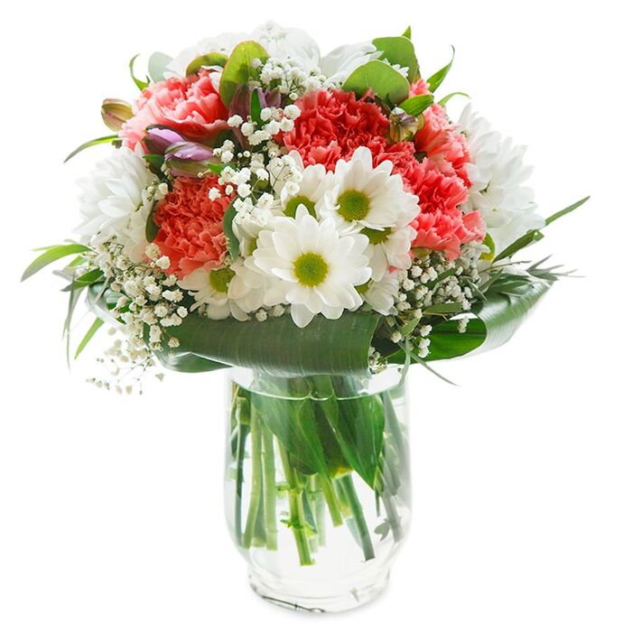 Some bouquets seem to gather the spirit of a place with every stem-this arrangement does just that for Old Ford. Vibrant coral and peach carnations bloom confidently, radiating with ruffled softness, while accents of vivid red speak to passion and friendship. At their edges, crisp white daisies with cheerful chartreuse eyes bring a lively, openhearted feeling that echoes the laughter found around Victoria Park's playgrounds. Wispy clouds of baby's breath add gentleness and gentle movement, as if a spring breeze drifts through the arrangement. Nestled in the composition, a few closed, purple-brushed buds promise unfolding memories yet to come. The ensemble is cradled in a fan of deep green, glossy foliage, its lushness reminiscent of the shaded rows along Old Ford Road. All of this beauty is presented in a clean white bag with sturdy ribbon handles, perfect for gifting on a birthday, a housewarming just off Roman Road, or bringing a moment of thoughtful delight to a neighbour. Photographed against a limitless white background, every nuance of hue, texture, and expert placement shines, giving the recipient a sense of genuine local artistry and a heartfelt reminder that beauty thrives in the day-to-day moments of Old Ford living. Evoking joyful renewal and East London charm, this expertly arranged Old Ford bouquet bursts with cheerful white daisies, their golden-centered faces surrounded by clouds of coral-pink carnations. Each carnation's ruffled edge adds depth and a subtle, fluttering movement to the compact design. Soft sprays of gypsophila drift like tiny white stars, amplifying the arrangement's gentle brightness and airy grace, while discreet alstroemeria buds with blush and mauve tones hint at future blossoms yet to unfurl. Eucalyptus leaves and rich greenery provide a calming backdrop, balancing the vivacious floral hues and framing the round composition-a subtle homage to the verdant parks and leafy streets of Old Ford. Designed for gift-giving or adding fresh beauty to a Riverside flat, this bouquet captures the optimism and warmth that define the area. The harmonious blend of colour and texture, coupled with natural freshness, stands as a testament to local florist craftsmanship-bringing a sense of peaceful celebration and daily delight to those in and around Old Ford. This vibrant bouquet channels the welcoming energy of Old Ford, combining lively colour and classic style in a fresh arrangement crafted by local hands. At the centre, coral-pink carnations burst with textured richness, their ruffled petals radiating movement and cheer. Surrounding them, crisp white chrysanthemums and sweet daisies with green-yellow centres evoke simplicity and optimism-like the first blooms seen in the nearby green spaces surrounding the Hertford Union Canal. Feathery white gypsophila threads between the blooms, lending the arrangement a cloud-like softness, while magenta alstroemeria buds wait on the periphery for their moment to unfurl. Nestled within a collar of deep, glossy green leaves, the bouquet is given a solid, elegant foundation. The arrangement sits in a crystal-clear vase, its long, graceful stems visible through the water-evidence of freshness and careful selection. The entire composition is illuminated with gentle, even light, celebrating each element's natural form and hue. Ideal for marking a special birthday, sharing a note of encouragement, or simply bringing a burst of positivity into a home or office in Old Ford, this bouquet is designed to lift spirits and celebrate the best of local floral artistry.